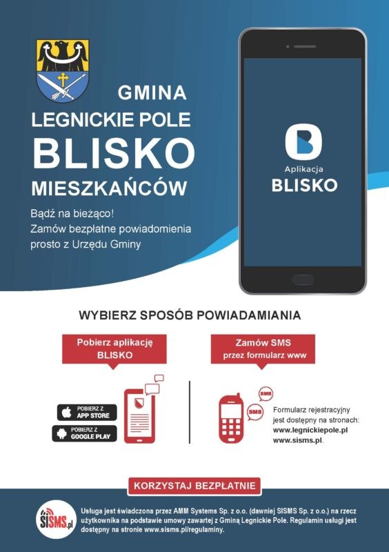 Wybierz sposób powiadamiania: Pobierz aplikację BLISKO lub Zamów SMS przez formularz www. Formularz rejestracyjny jest dostępny na stronach: www.legnickiepole.pl oraz www.sisms.pl.