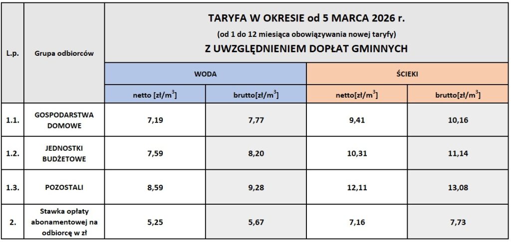 Gminny Zakład Gospodarki Komunalnej Legnickie Pole sp. z o.o. informuje, że w dniu 26 lutego 2026 r. w Biuletynie Informacji Publicznej została ogłoszona Decyzja nr V.RZT.70.60.2025 z dnia 17.02.2026 r. Dyrektora Regionalnego Zarządu Gospodarki Wodnej we Wrocławiu PGW Wody Polskie, zatwierdzająca nowe taryfy dla zbiorowego zaopatrzenia w wodę oraz zbiorowego odprowadzania ścieków na terenie Gminy Legnickie Pole na okres 3 lat.